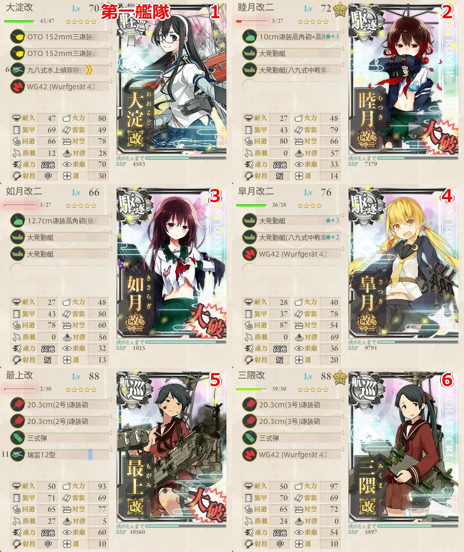 大淀:OTO*2、夜偵、WG42⇒2隻目がいないときは夕張