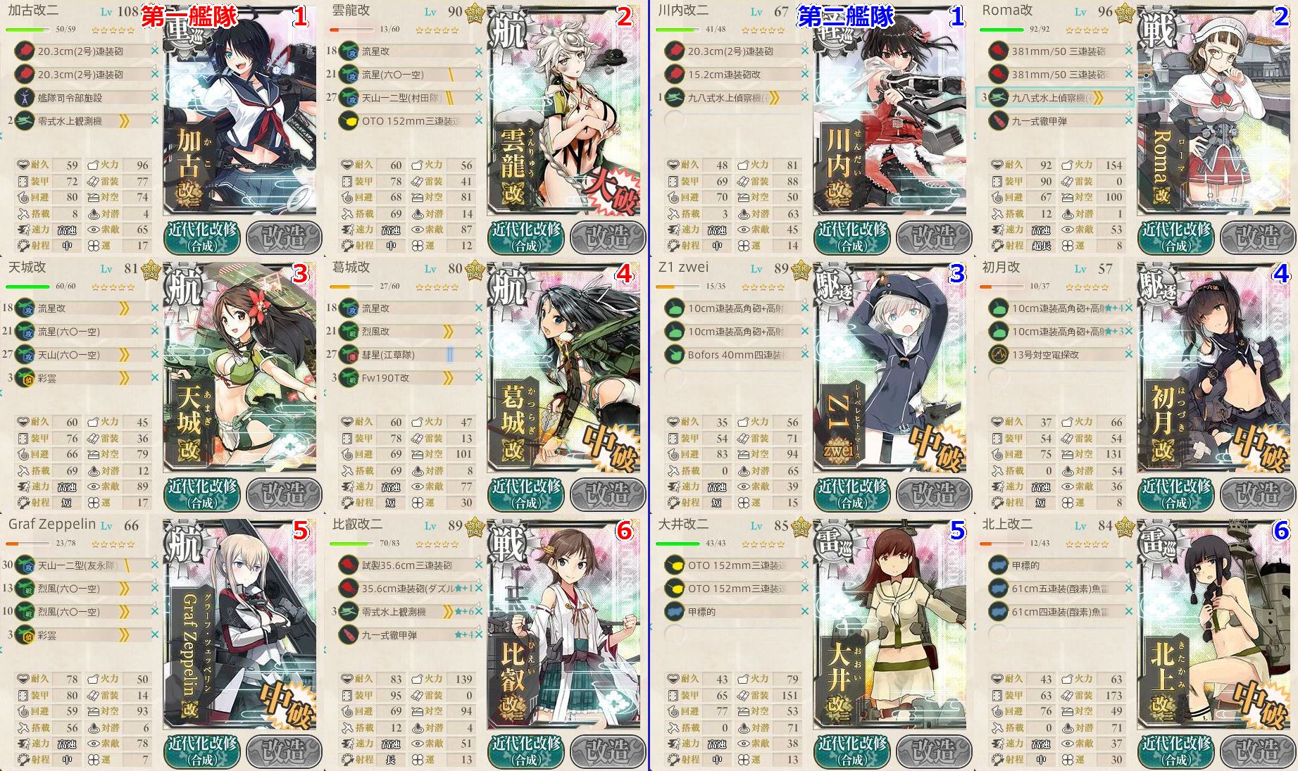 川内:20.3(2号)、15.2連装砲改、夜偵